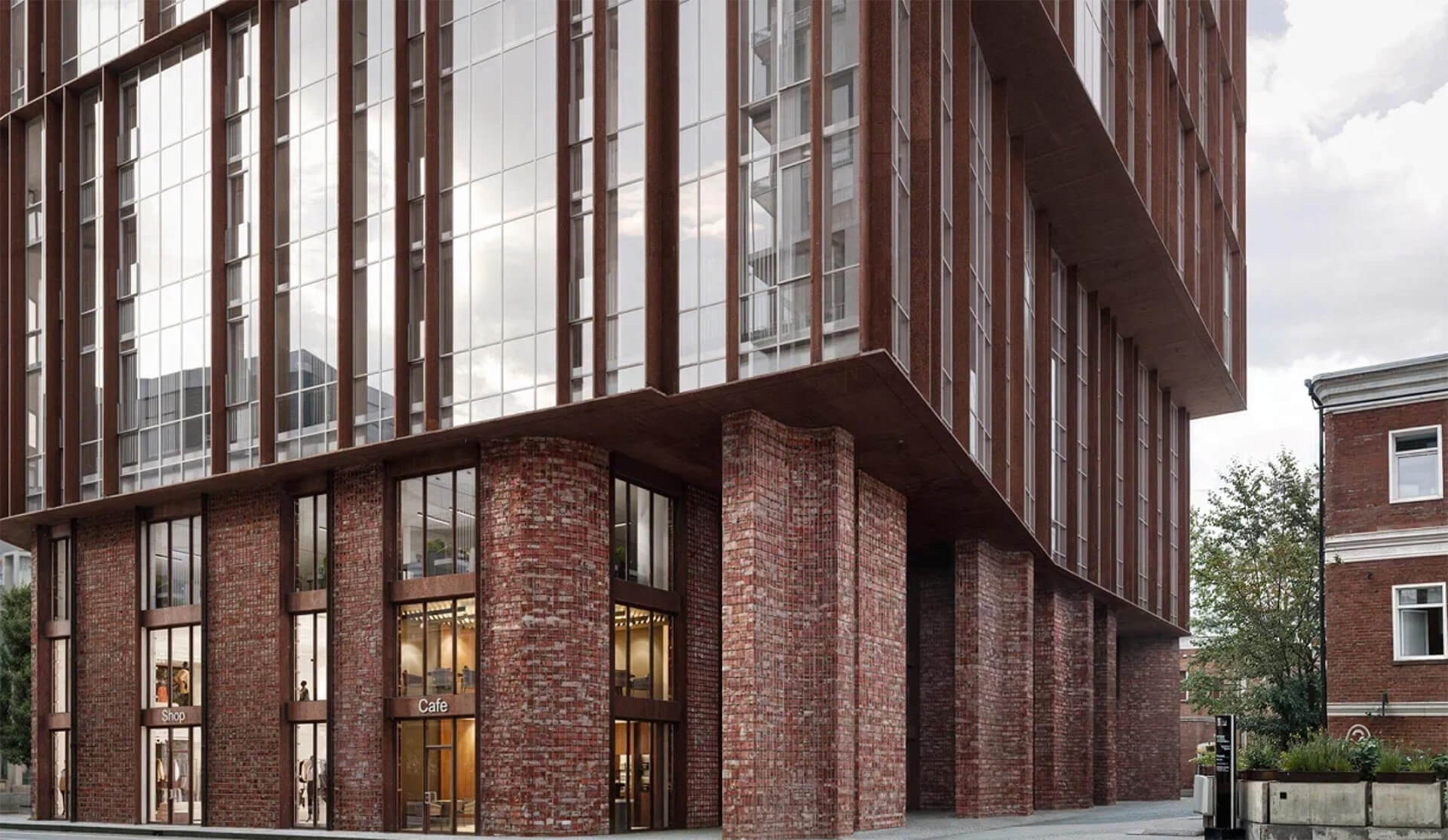 Фасадная оболочка состоит из зеркальных панелей, которые отражают окружающий квартал и создают визуальный эффект лёгкости. Кортен-сталь и габионы из битого кирпича подчёркивают индустриальное наследие места, где когда-то находились цеха текстильной мануфактуры. Именно это сочетание прошлого и будущего делает архитектуру комплекса уникальной и узнаваемой, символизируя культурную преемственность и технологический прогресс.