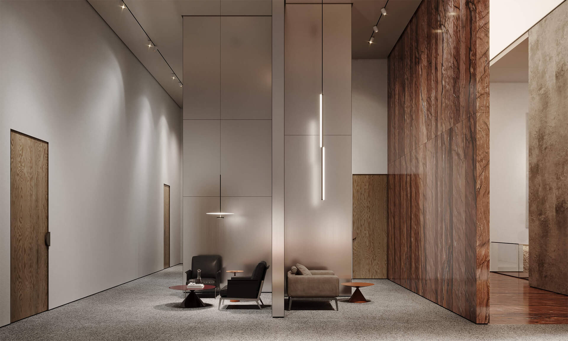 Входная зона «Башни Рябов» спроектирована как пространство престижного уровня: потолки увеличенной высоты, обширная площадь, дизайнерское освещение, материалы премиум-класса — мрамор, стекло, кортен-сталь. Лобби наполнено естественным светом через панорамное остекление, создаёт впечатление простора, и сразу формирует ощущение высокого уровня офиса, подчёркивая статус здания.