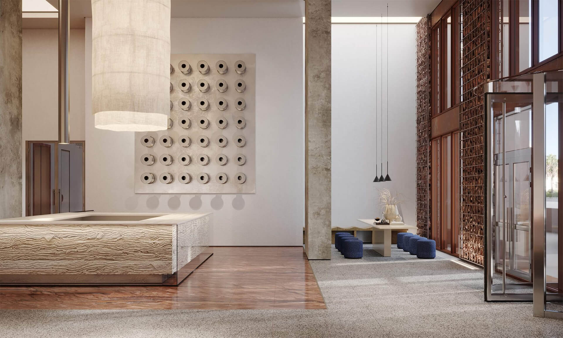 Входная зона «Башни Рябов» спроектирована как пространство престижного уровня: потолки увеличенной высоты, обширная площадь, дизайнерское освещение, материалы премиум-класса — мрамор, стекло, кортен-сталь. Лобби наполнено естественным светом через панорамное остекление, создаёт впечатление простора, и сразу формирует ощущение высокого уровня офиса, подчёркивая статус здания.